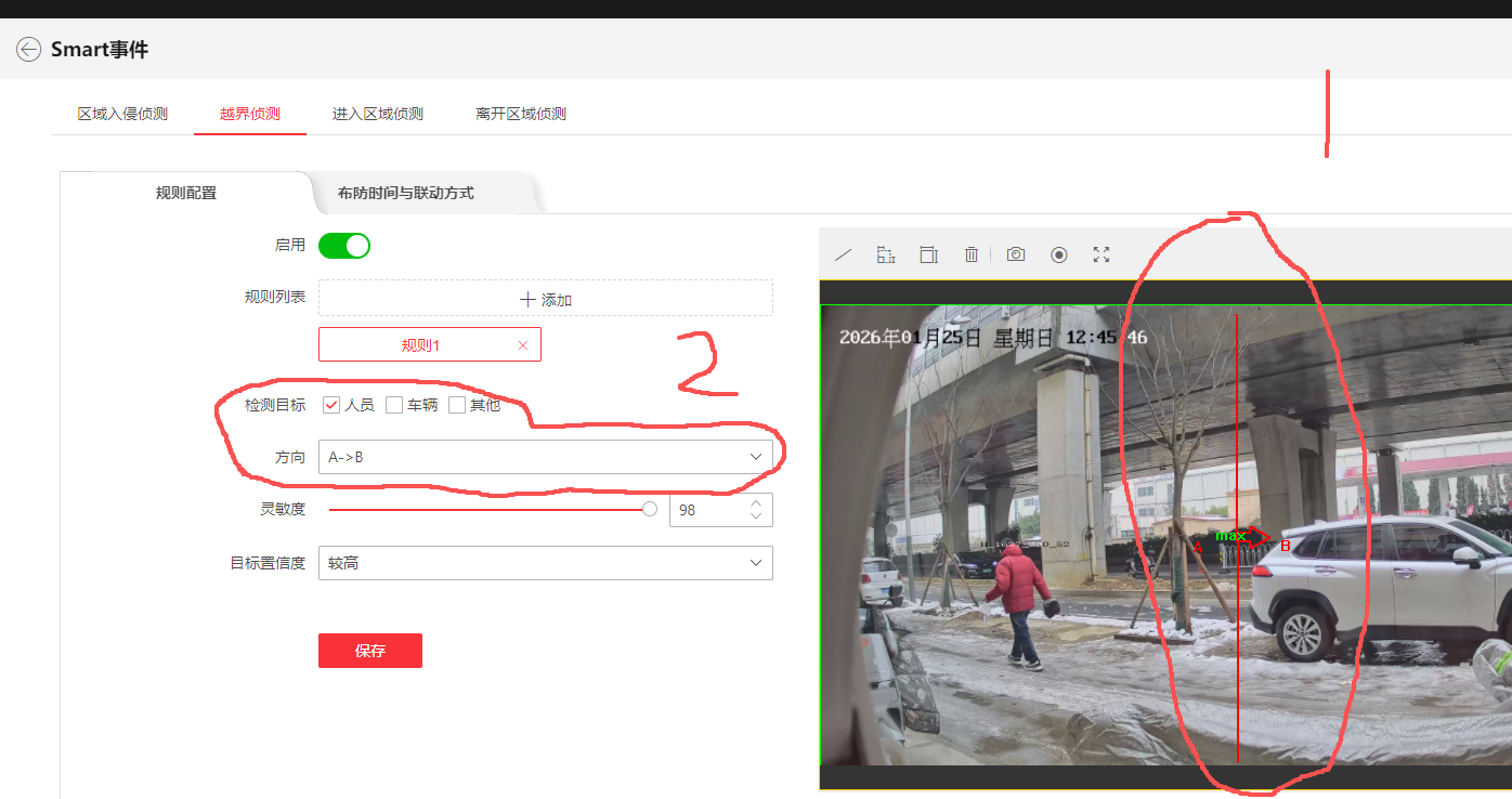 如下图,海康智能600万像素 支持智能事件报警,直传监控室。 在画面上画一道线。左边是A 右边是B 当有人或者车从A到B 监控报警。是不是和电子围栏一样的功能