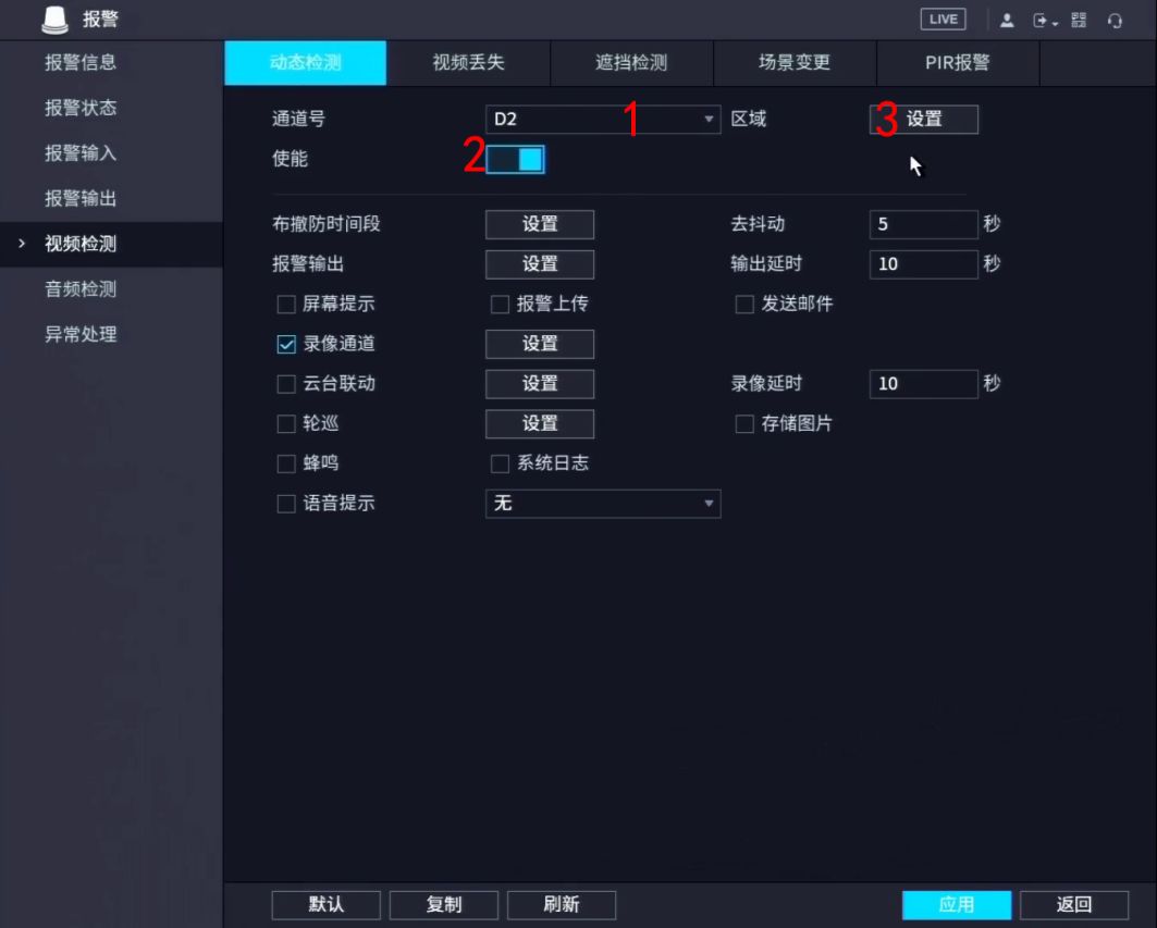 第三种报警 报警录像是咱们设置报警事件 需要在事件设置里设置 如人进入区域报警 报警方式很多 具体看前端摄像头是否支持